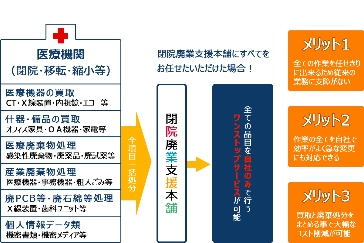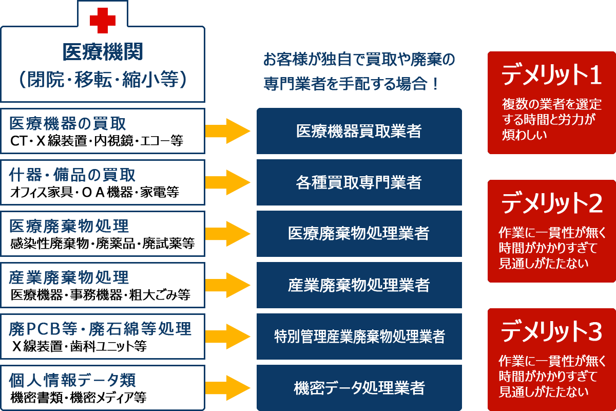 医療機器買取は中古医療機器業者、什器・備品買取は各種買取業者、医療廃棄物処理(感染性、廃薬品、試薬)は特別管理産業廃棄物処理業者、産業廃棄物処理(医療機器、事務機器、粗大ごみ等)は産業廃棄物処理業者、個人情報データ類は 機密データ処理業者等、複数の専門業者が必要になります。そのため、専門業者の種類も多く複雑で、どこに頼めばよいか判断に迷います。